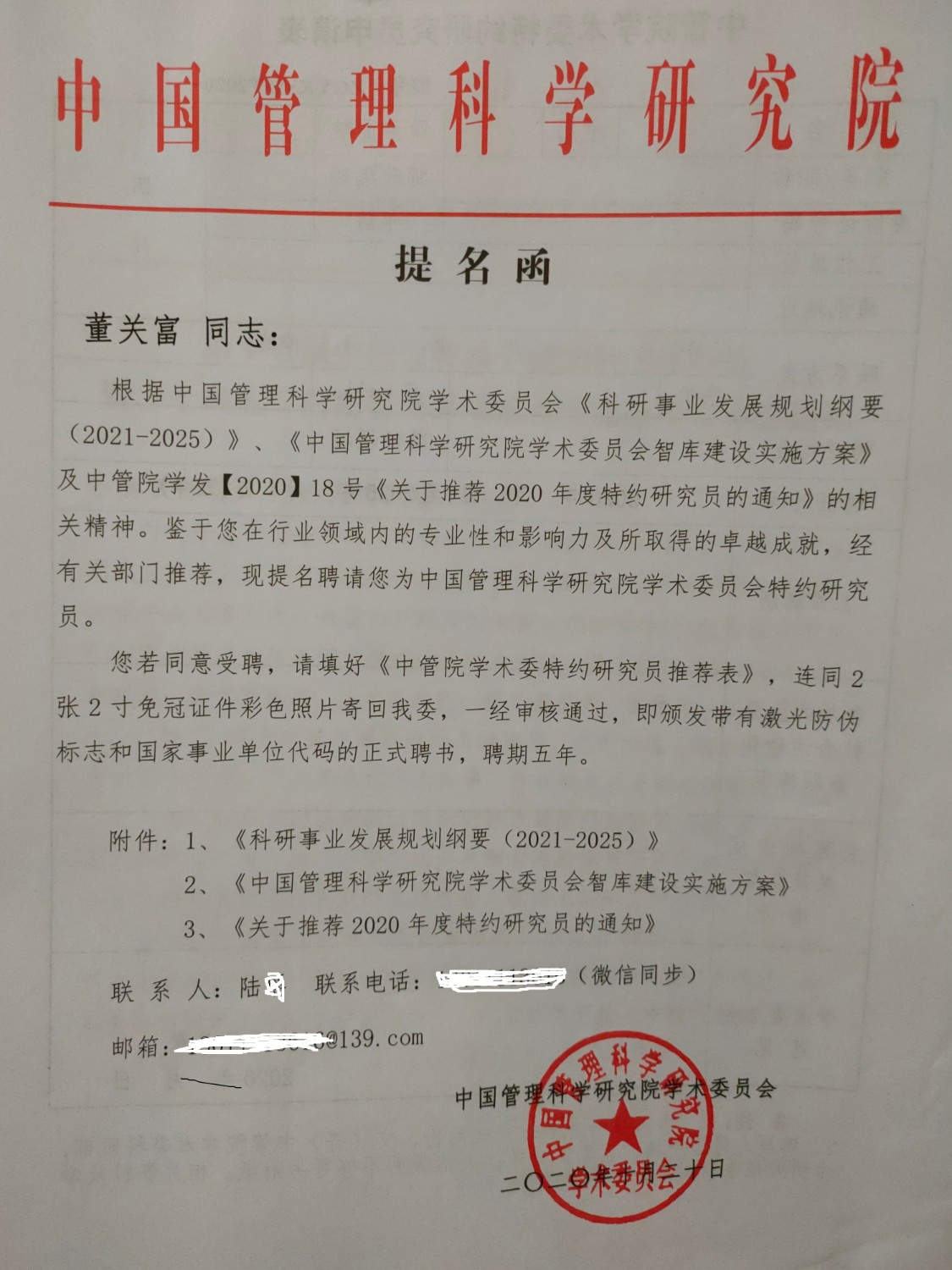 根據中國管理科學研究院學術委員會<<研究事業(yè)發(fā)展規(guī)劃綱要2021~2025>><<中國管理科學研究院學術委員會智庫建設實施方案>>及中管院發(fā)布[2020]十八號關于《推薦2020年特度研究員的通知》相關精神。建議鑒于您在行業(yè)領域內的專業(yè)性和影響力,及所取的專業(yè)成績,經有關部門推薦?,F提名聘請你為中國管理科學研究院學術委員會所特約研究員。