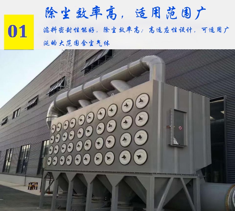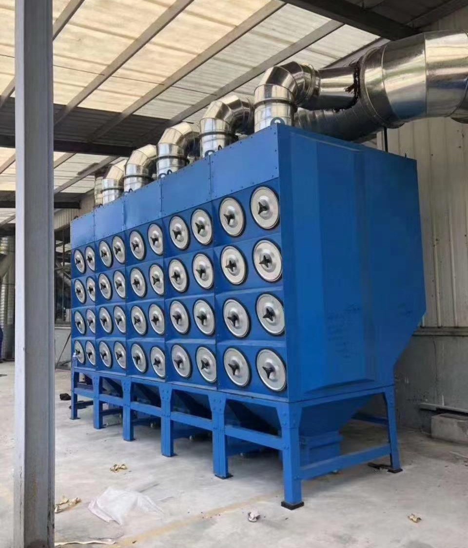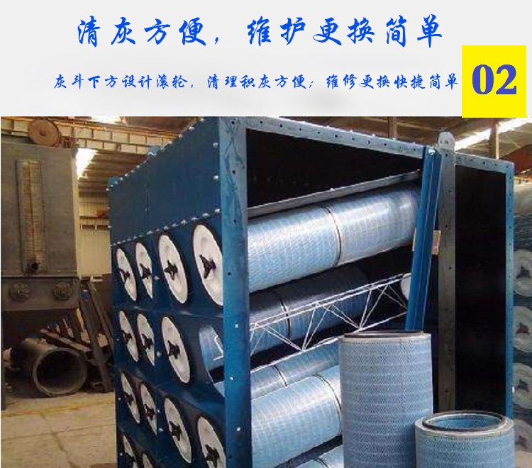 而較細粉塵均勻地進入中部箱體而吸附在濾筒的外表面上,干凈氣體透過濾筒進入上箱體,并經(jīng)各離線閥和排風管